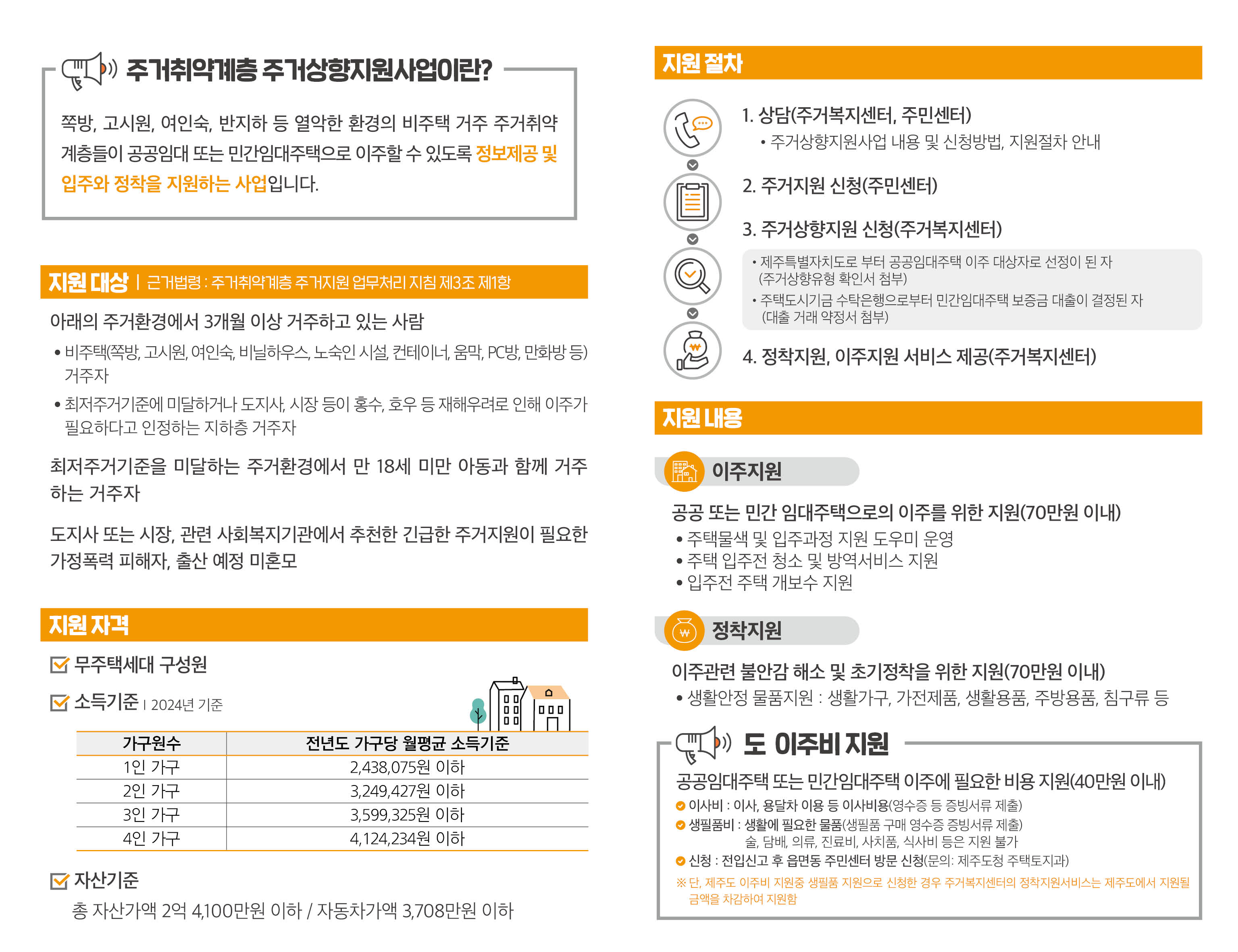 쪽방·고시원, 여인숙, 반지하 등 열악한 환경의 비주택 거주 주거취약계층들이 공공임대 또는 민간임대주택으로 이주할 수 있도록 입주부터 정착까지 지원하는 사업입니다.